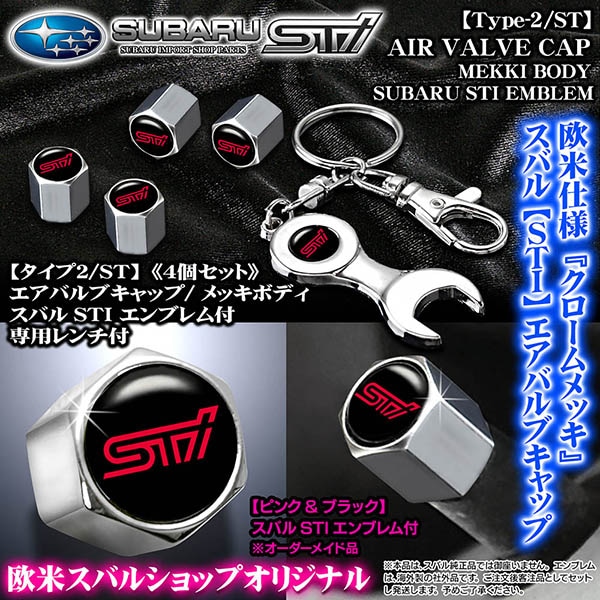 【スバルSTIエンブレム付】メッキボディ/エアバルブキャップ[タイプ2/ST]4個セット&専用レンチ付[汎用品]ブラガ客注品