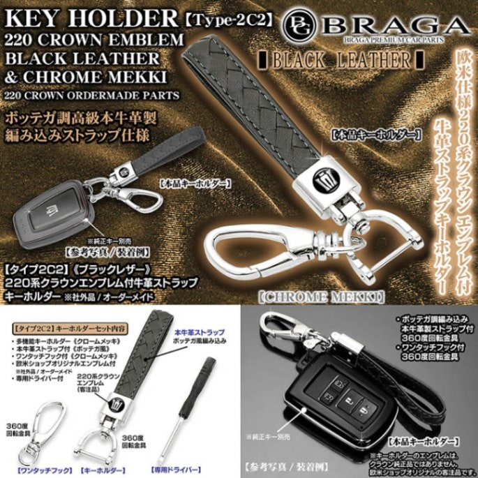 《220系クラウン エンブレム付キーホルダー》【タイプ2C2】3D立体エンブレム/ブラック牛革製ストラップ&クロームメッキ金具キー...