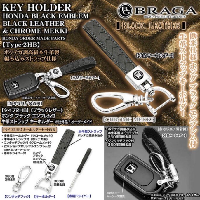 《ホンダマーク ブラックエンブレム付キーホルダー》[タイプ2HB]3D立体エンブレム/ブラック本牛革製ストラップ&クロームメッキ金...