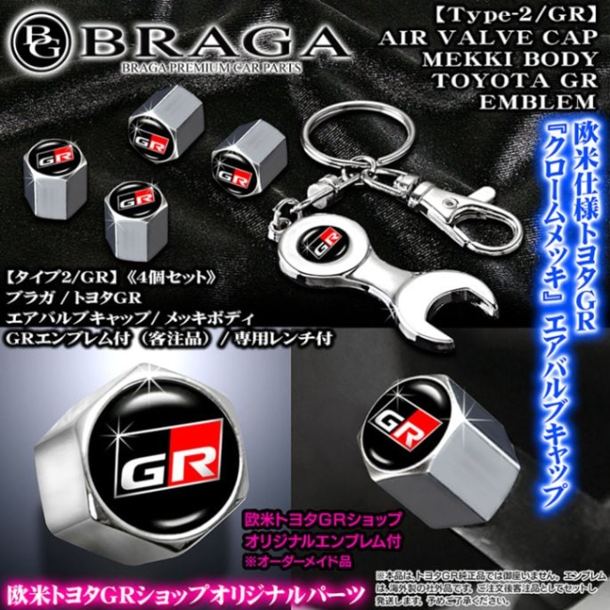 トヨタGR【GRエンブレム付】メッキボディ/エアバルブキャップ《タイプ2/GR》4個セット&レンチ付[汎用品]欧米仕様/客注品/ブ...