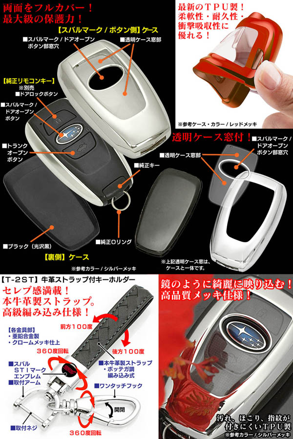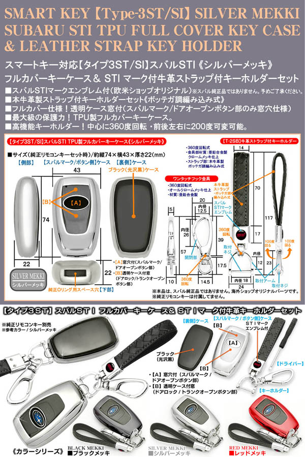タイプ3ST/SI【スバルSTI/シルバーメッキ】スマートキー対応TPU製フルカバーキーケース & STIマーク付牛革ストラップ ...