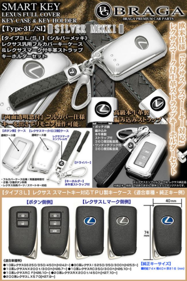 ブラガ/レクサス車用互換品TPU製キーケース[タイプ3L/SI シルバーメッキ]スマートキー対応エンブレム付牛革ストラップ キーホ...