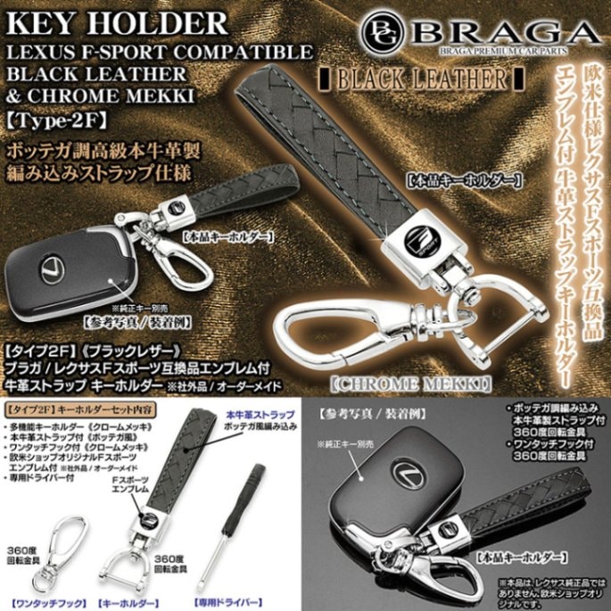 ブラガ/レクサスFスポーツ互換品エンブレム付【タイプ2F】ブラック牛革ストラップ&フック付ボッテガ調キーホルダー/客注品