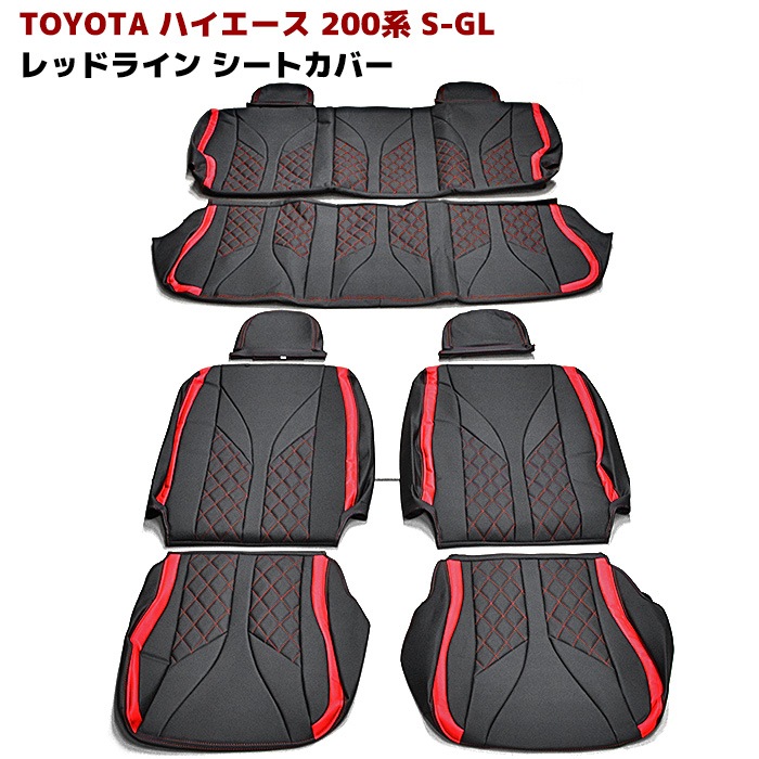 200系ハイエース S-GL シートカバー レッドライン ダイヤカット PVCブラックレザー ステッチレッド 1台分 内装 カスタ...