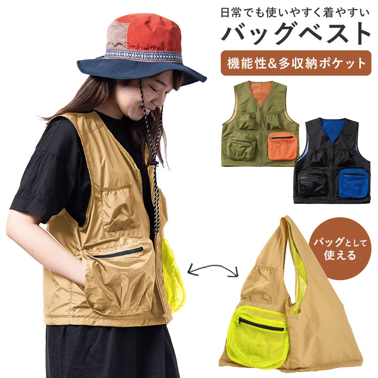 アウトドア ベスト レディース メンズ メッシュベスト ウェア バッグ 2way 撥水 大容量 軽量 多機能 ポケット 便利 女性...