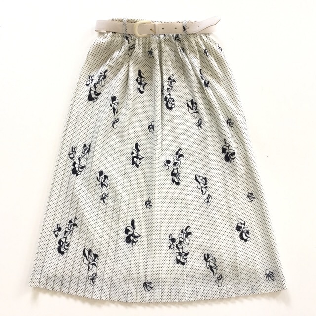 昭和レトロ プリーツスカート 水玉スカート 送料無料 M/白x黒 ドッド 花柄 ミモレ丈 ヒダスカート モダン レディース 国内古...