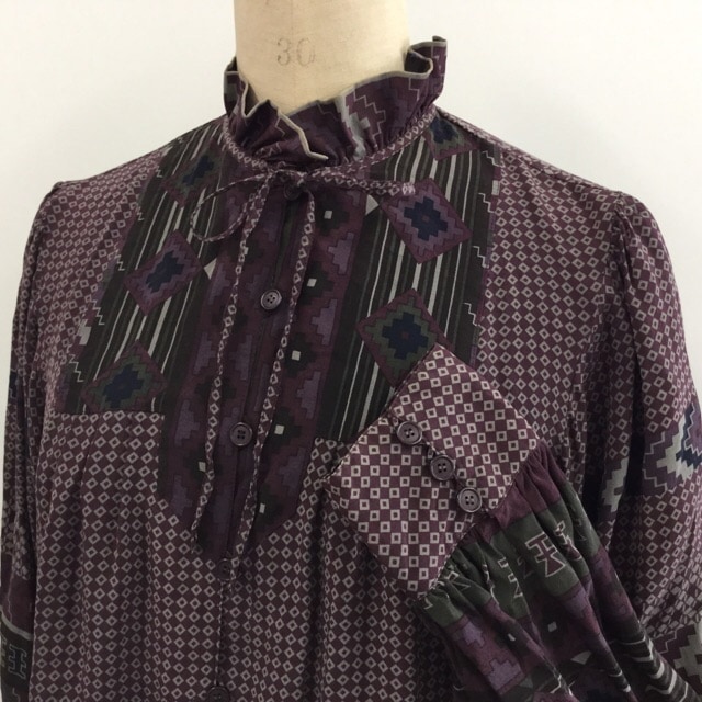 昭和モダン 長袖ブラウス サイズF/小豆色系 レトロ柄 フォークロア リボン シルク レディース 国内古着 送料無料