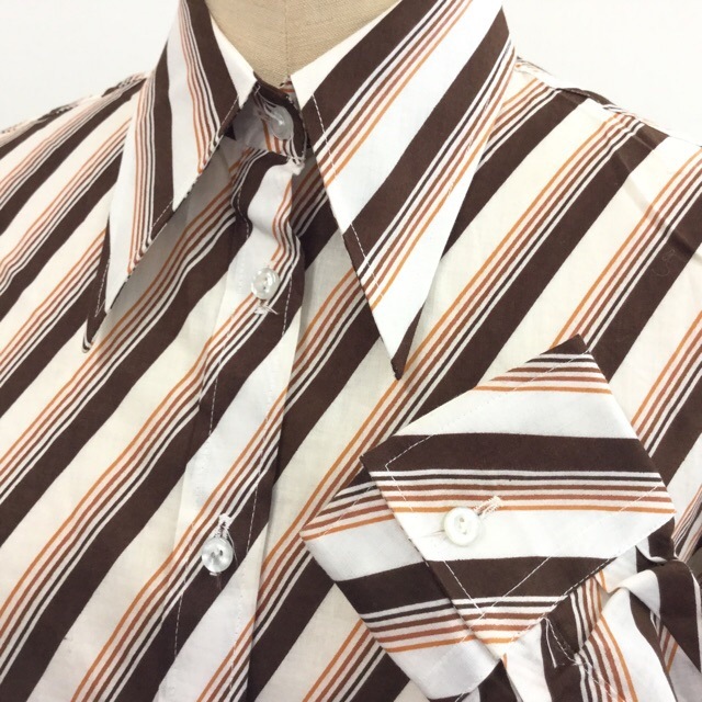 昭和レトロ 70年代 長袖ブラウス サイズ11/白x茶系 グラデーション ストライプ モダン ビンテージ 国内古着 送料無料