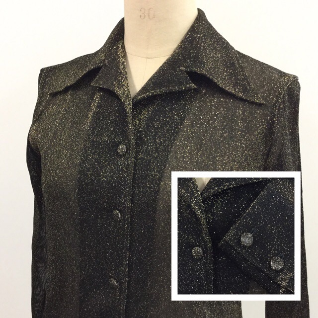 昭和レトロ 70年代 長袖ブラウス サイズ11/黒 ラメ ポリシャツ オープンカラー モダン ビンテージ 国内古着 送料無料