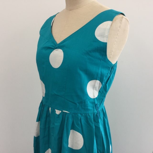 昭和レトロ ビンテージ ノースリーブワンピース サイズ9/エメラルドグリーン ドッド 水玉 ギャザースカート 送料無料 国内古着