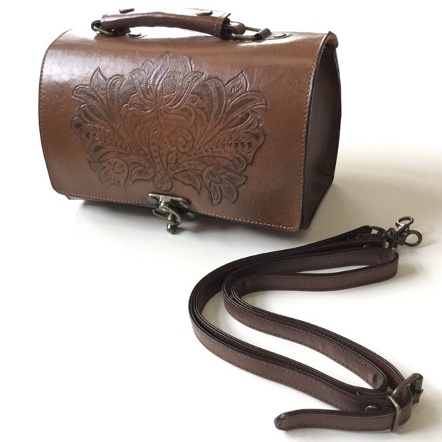 アメリカ古着 レザーバッグ ハンドバッグ 送料無料 2WAY 本革/茶 ショルダーバッグ 型押し ボタニカル 古着卸 業販