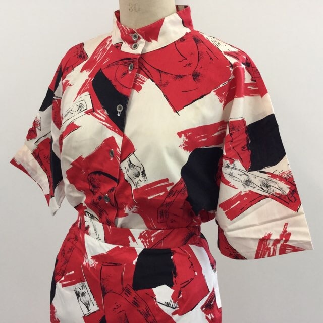 昭和レトロ 80年代 半袖ツーピース サイズS程度/総柄 カジュアル アート スーツ 日本古着 送料無料