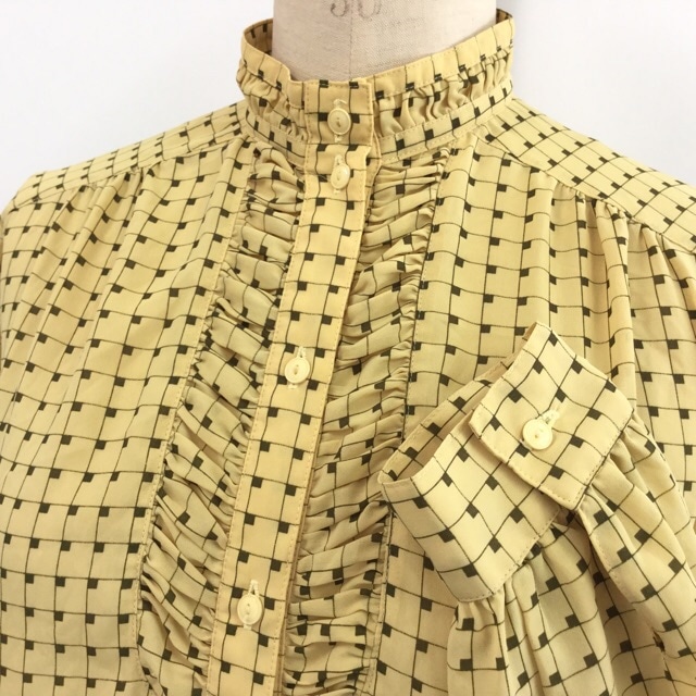 昭和モダン 長袖ブラウス サイズM/黄色系 レトロ柄 スタンドカラー ギャザー ポリ シフォン レディース 国内古着 送料無料