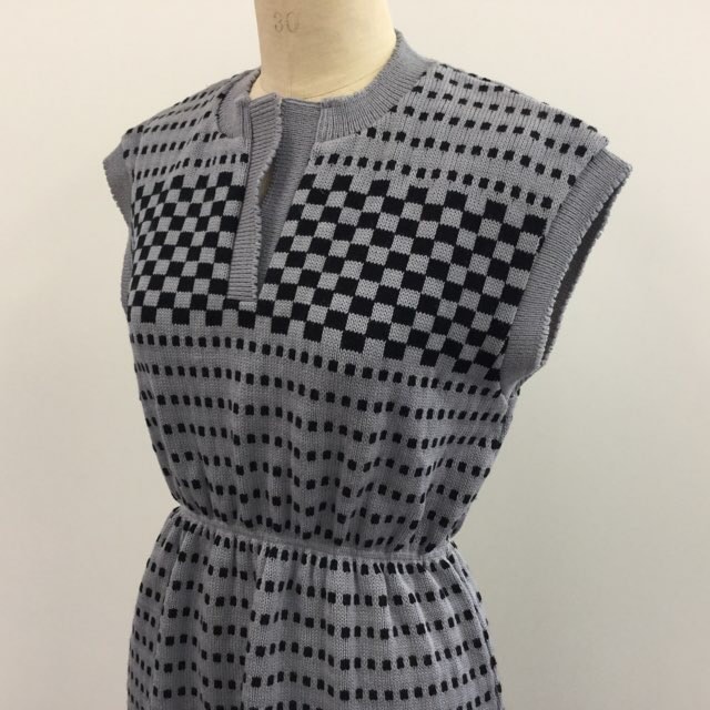 昭和モダン ビンテージ 70年代 レトロ ニットワンピース サイズフリー/グレー 格子模様 市松模様 送料無料 国内古着