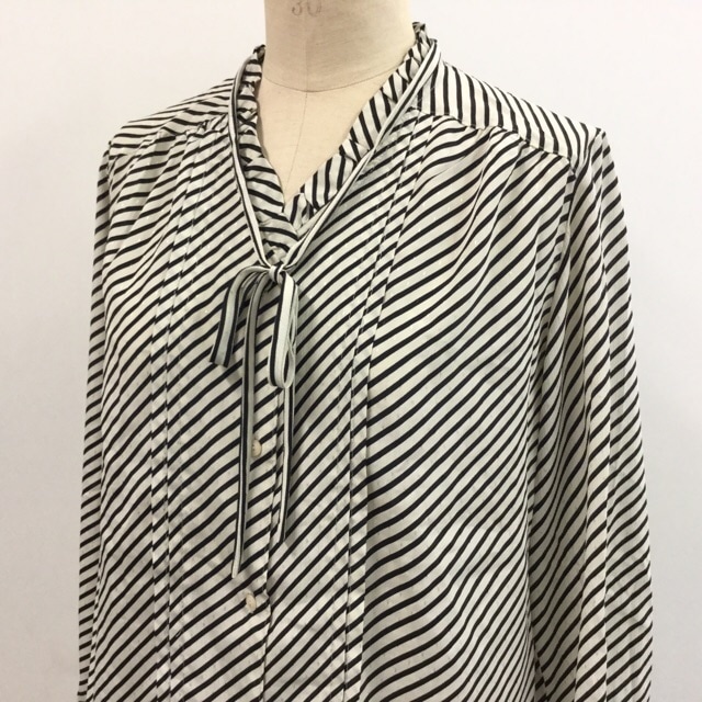 昭和レトロ 長袖ブラウス サイズ11/白x黒 ポリシャツ リボン フリル 斜めストライプ レディース 国内古着 送料無料