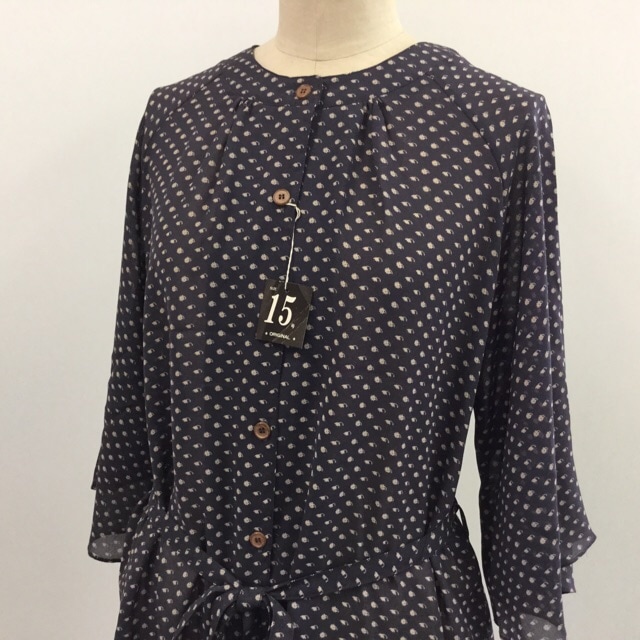 未使用 昭和モダン 70年代 レトロ 半袖ブラウス サイズ15/紺系 小花柄 デッドストック 送料無料 国内古着