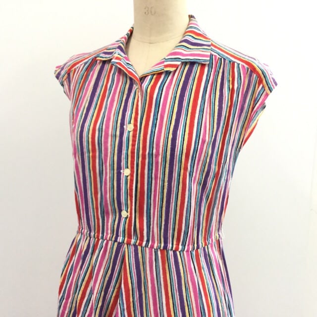 昭和レトロ ノースリーブワンピース サイズM程度/マルチ レインボー ストライプ ギャザースカート ドレス レディース 送料無料...