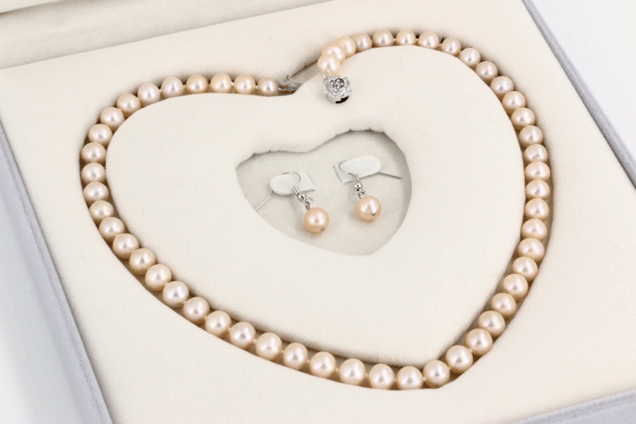 つやたま真珠 本真珠ネックレス&ピアスorイヤリングセット ピンクカラー 7.5-8.0mm ハートキーパーボックス付