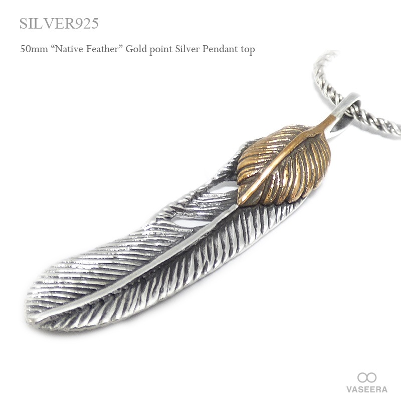 50mm ネイティブ・フェザー(羽根) ゴールドポイント シルバー ペンダント トップ 【シルバー925/SILVER925 /ペ...