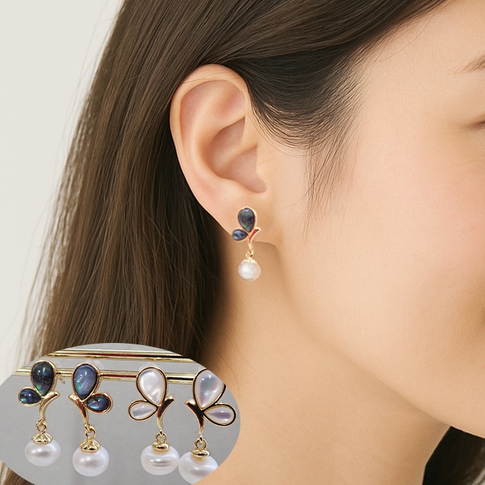 淡水パール ピアス レディース 花・蝶・ハートモチーフ 天然シェル 大人可愛い 揺れる 両耳用