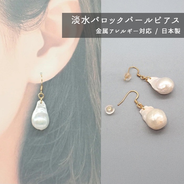 日本製 大粒バロック 淡水パール オイスター フックピアス ステンレス(316) 1ペア アレルギー対応