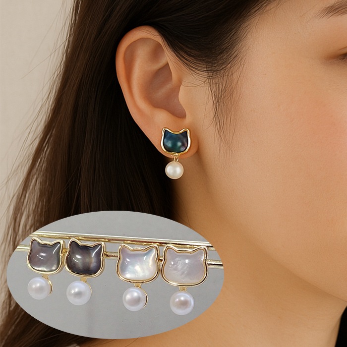 猫モチーフ ピアス アバロンシェル×ホワイトパール 上品アクセサリー ゴールドカラー 猫好き