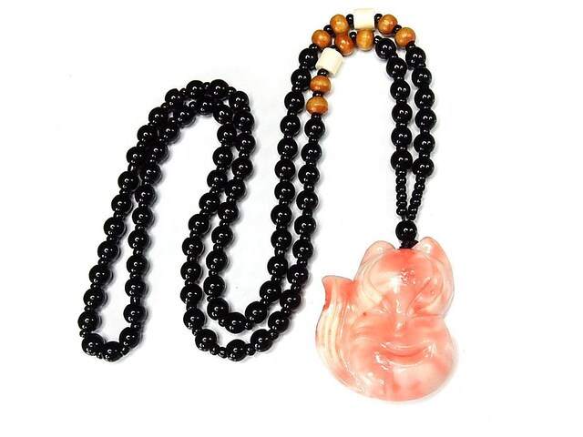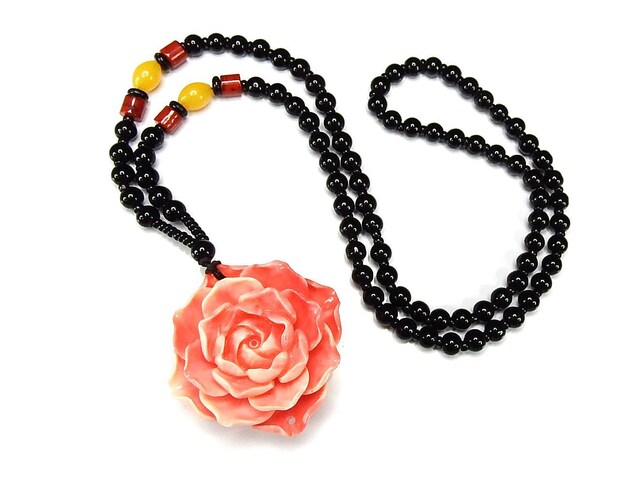 練り珊瑚ピンクきつね黒ビーズネックレスセーターチェーン