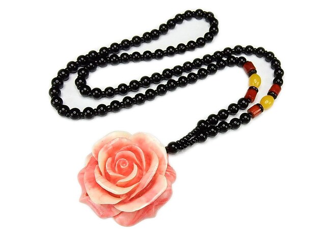 オシャレ可愛いピンクマザーオブパール両面花黒ビーズネックレス石街