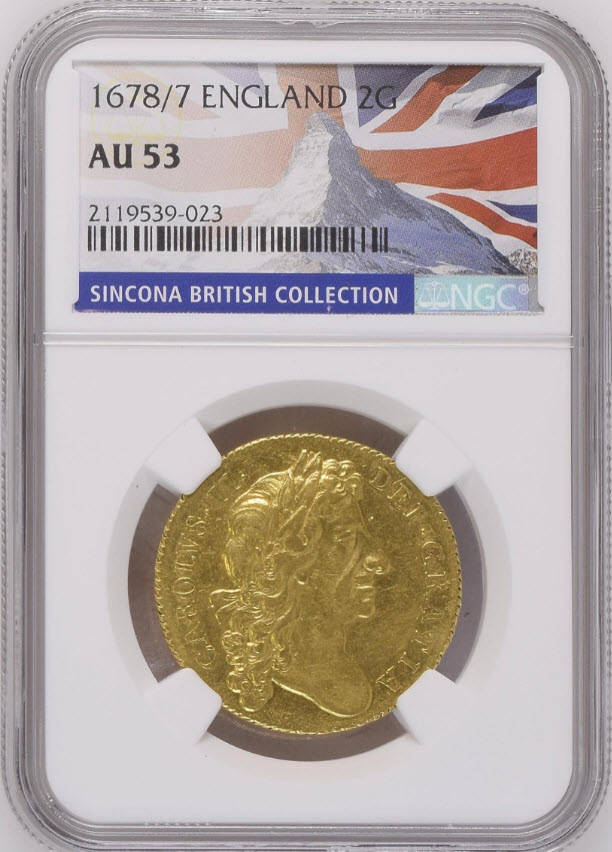 【レア度2-R2】グレートブリテン 1678/7年 チャールズ2世 2ギニー金貨 NGC-AU53