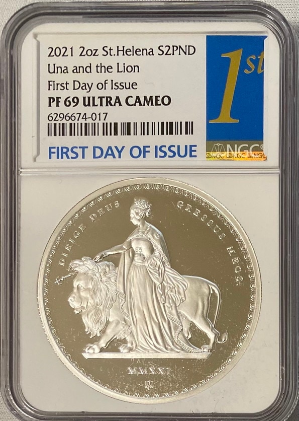 2021年グレートブリテン領セントヘレナ-エリザベス2世ウナとライオン2ポンドプルーフ銀貨NGC社PF69UCAMファーストデイオ...