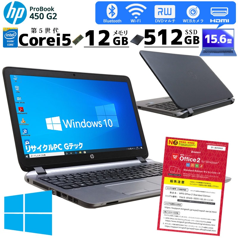 新品SSD 中古ノートパソコン HP Probook 450 G2 Windows10 Corei5 5200U メモリ12GB...