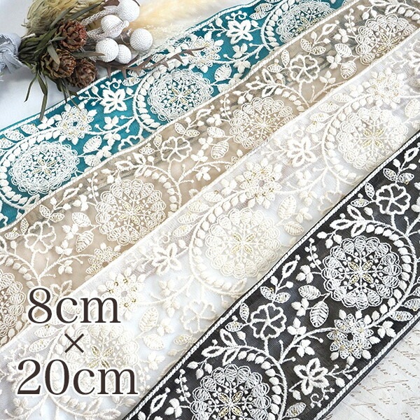 8cm幅 太幅 花柄刺繍インドチュールリボン 刺繍ポーチ お守り袋 ヘアポニーアクセサリー資材 フラワーリボン 営業日即日発送