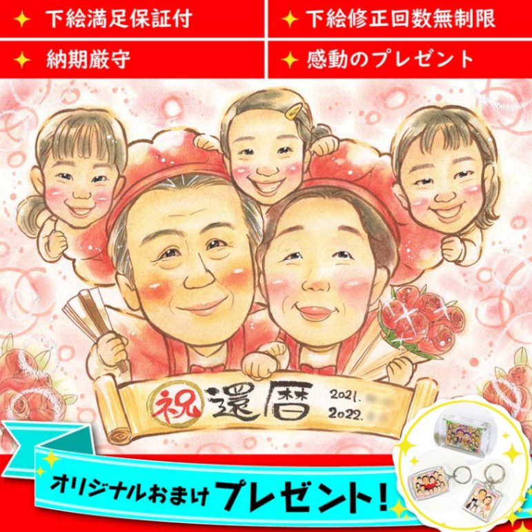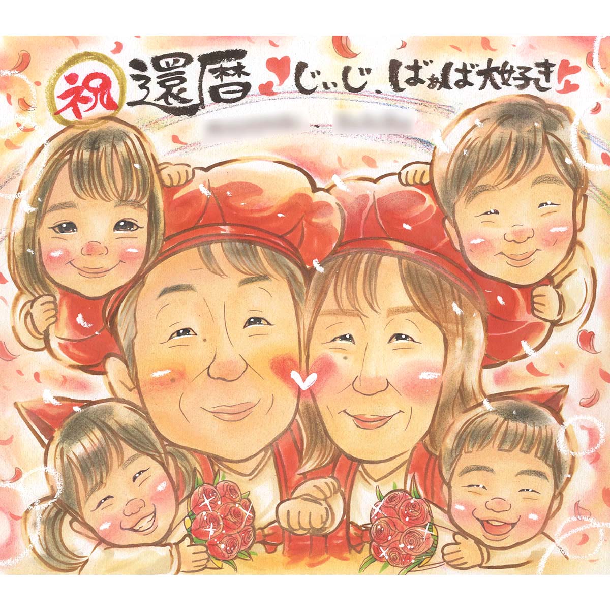 還暦を祝う夫婦の似顔絵 お孫さんも一緒に プレゼント お祝い 還暦 古希 喜寿 傘寿 米寿 卒寿 長寿 結婚記念日 結婚10周年 ...