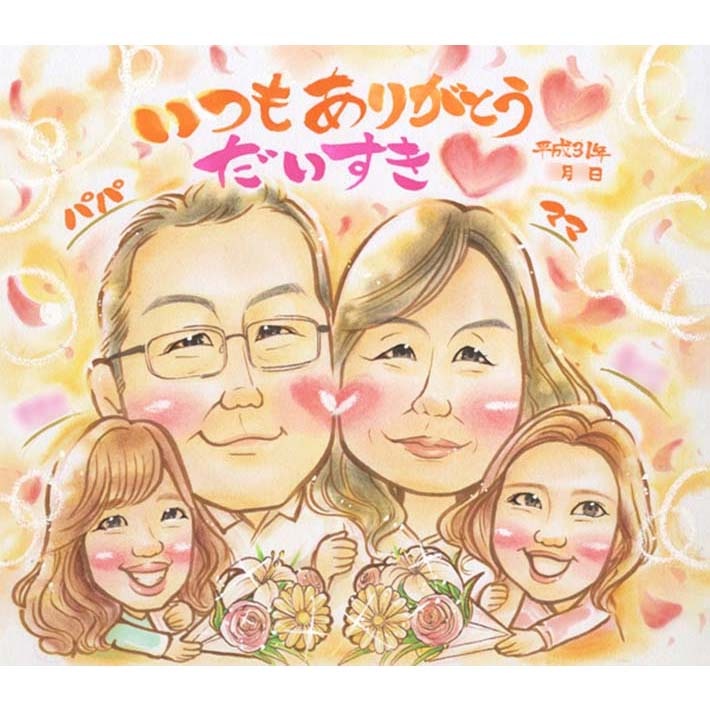ファミリー似顔絵 家族の似顔絵 プレゼント お祝い 結婚 定年 退職 男性 女性 誕生日 結婚記念日 贈呈用 金婚 銀婚 還暦 古...