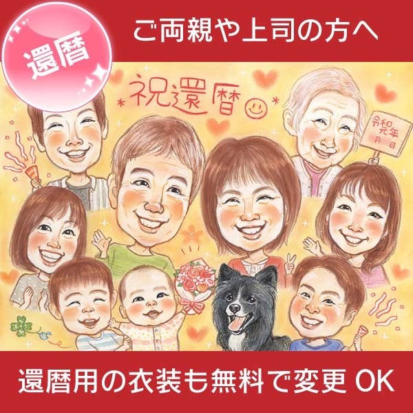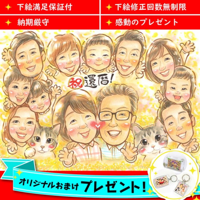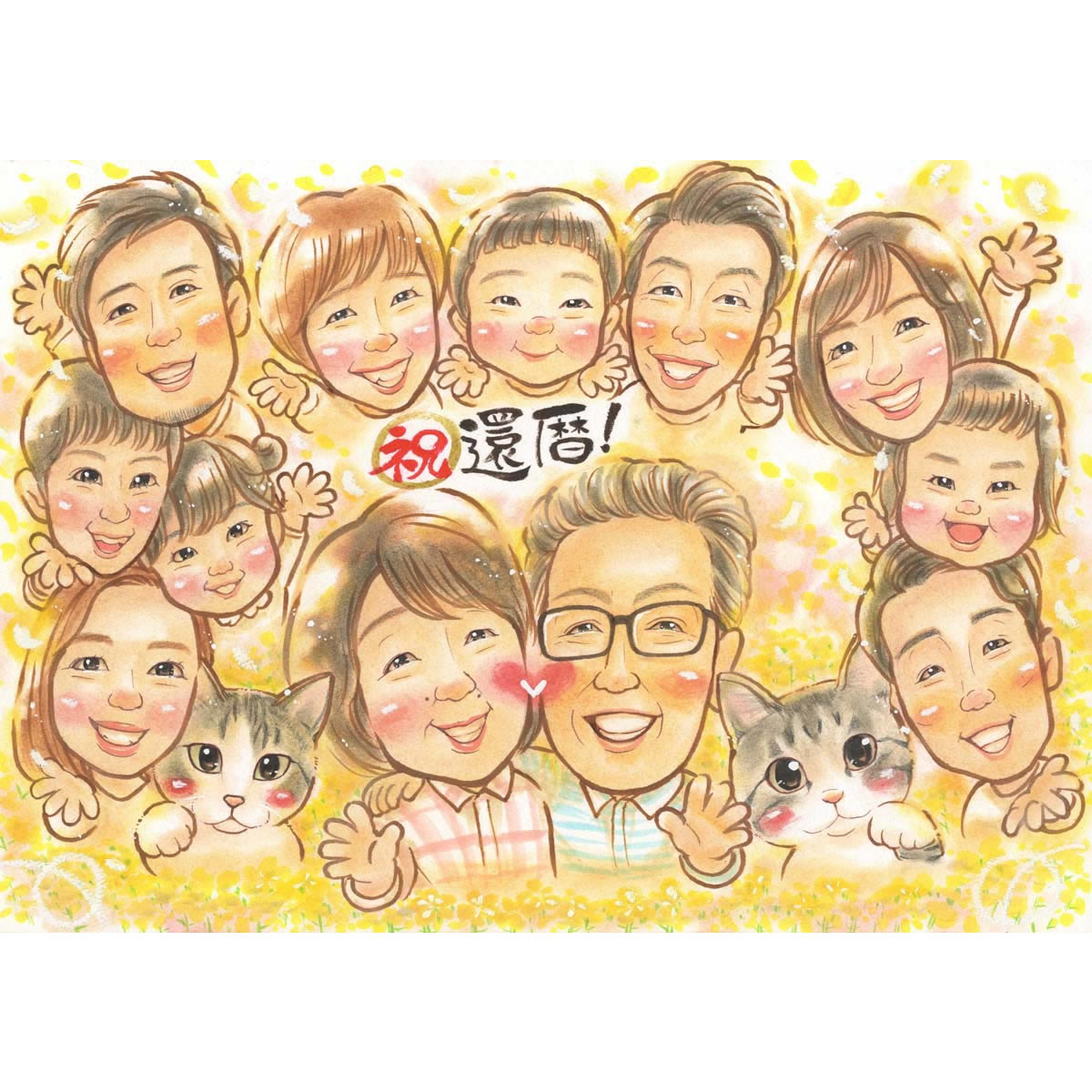 祝 60歳 還暦のお祝いに贈るオススメの似顔絵。子供、孫に囲まれた似顔絵は家族の絆が深まります。一期 プレゼント お祝い 還暦 古...