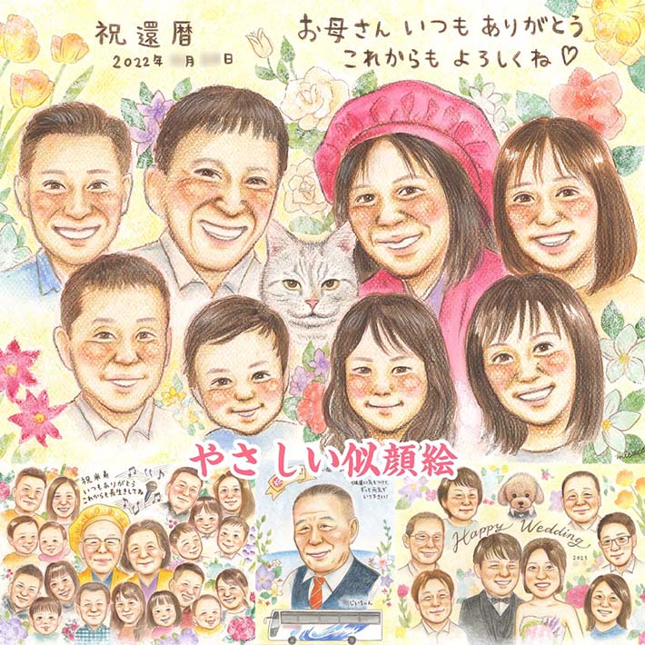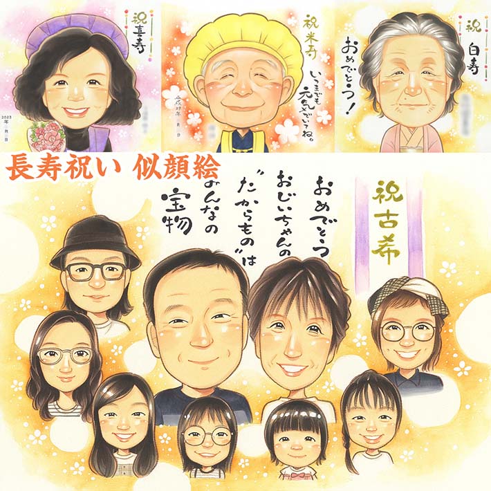 カワイイがあふれてる!幸せたっぷり似顔絵 プレゼント お祝い 還暦 古希 喜寿 傘寿 米寿 卒寿 長寿 結婚記念日 結婚10周年 ...