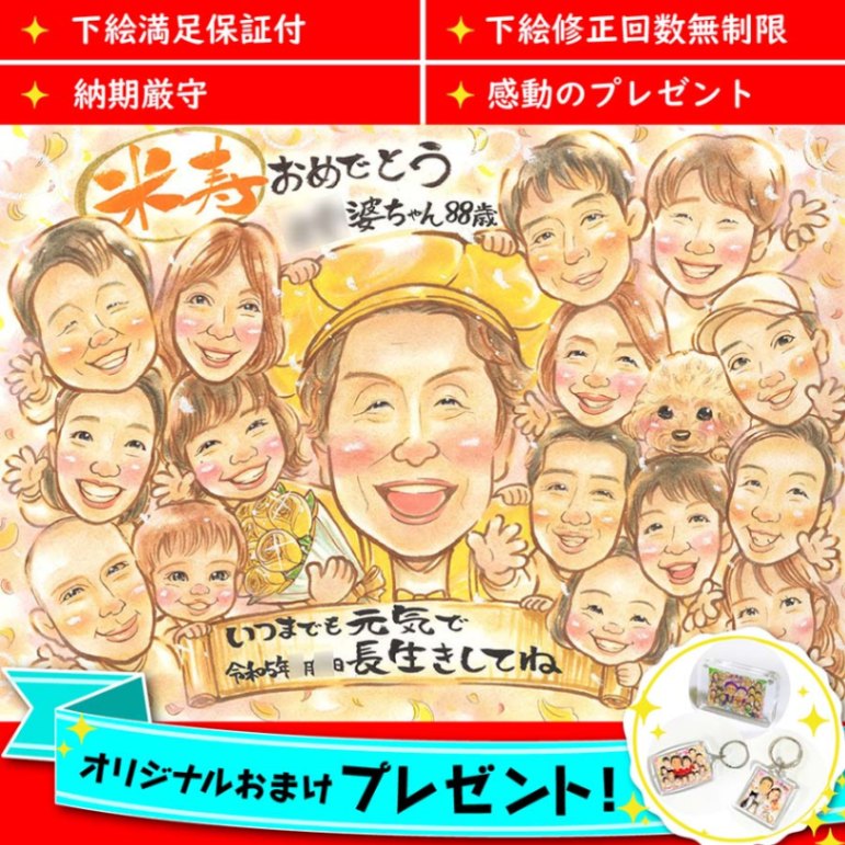 米寿のおじいちゃんおばあちゃんへ贈る家族の愛が込められた似顔絵プレゼント 家族で喜びを分かち合える米寿のお祝いにぴったりな似顔絵ギ...