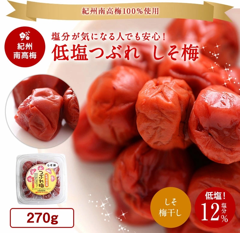 紀州南高梅 低塩つぶれ 梅干ししそ梅270g(塩分12%)5,400円以上で送料無料※北海道、沖縄除く