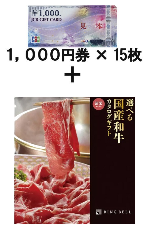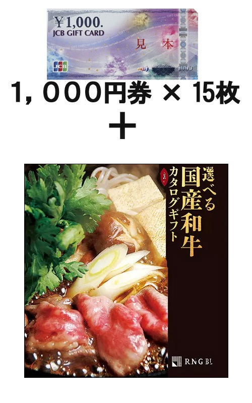 JCBギフトカード15枚 &選べる国産和牛カタログギフト 溌剌(はつらつ)