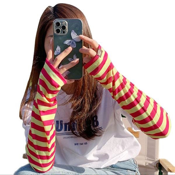 レディース ボーダー柄 アームカバー 指穴付き 指出しタイプ UVカット 紫外線対策 日よけ防止 スマホ操作 ドライブ 登山 キャ...