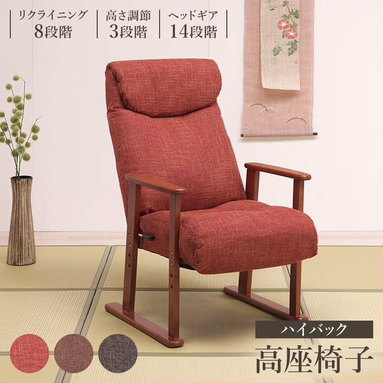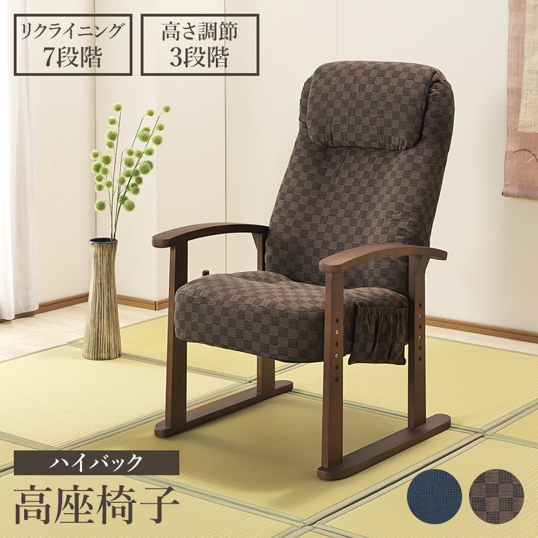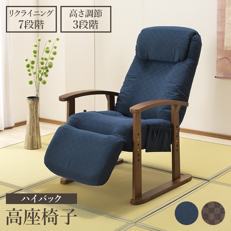 高座椅子 リクライニングチェア 肘置き付き アームチェア ブラウン ネイビー 高さ4段階調整可能 ハイバック