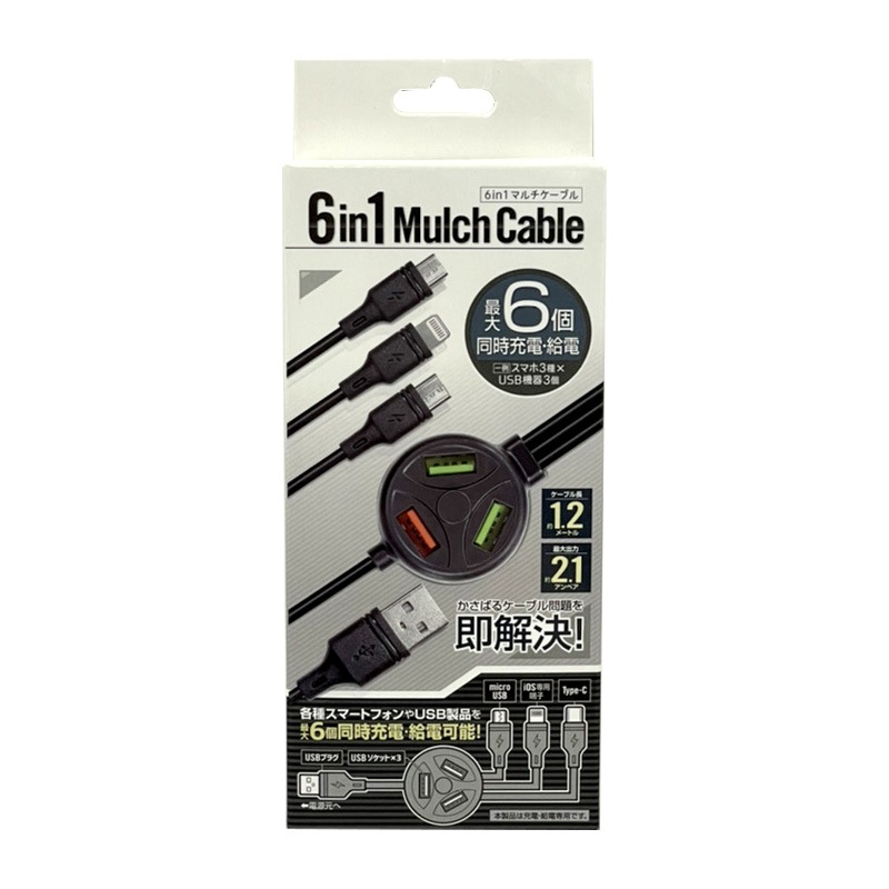 インターベース 6in1マルチケーブル 同時充電 給電 最大6個 2.1A 1.2mケーブル USB Type-C iOS端子 デ...