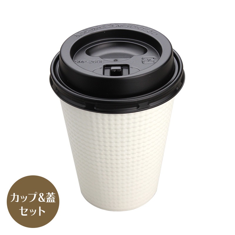 紙コップ蓋付 断熱性 エンボス紙コップ 白無地 SMP-260E リフトアップリッド 黒 トーカン 100個セット