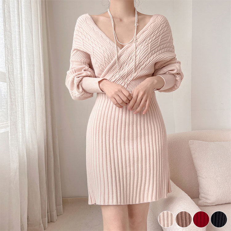 クロスネック 切り替え ケーブル編み ニット ミニワンピース
