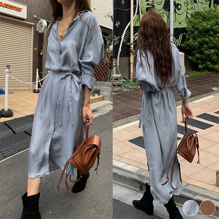 てろんと感 リボンベルト付き ミモレ丈 シャツワンピース