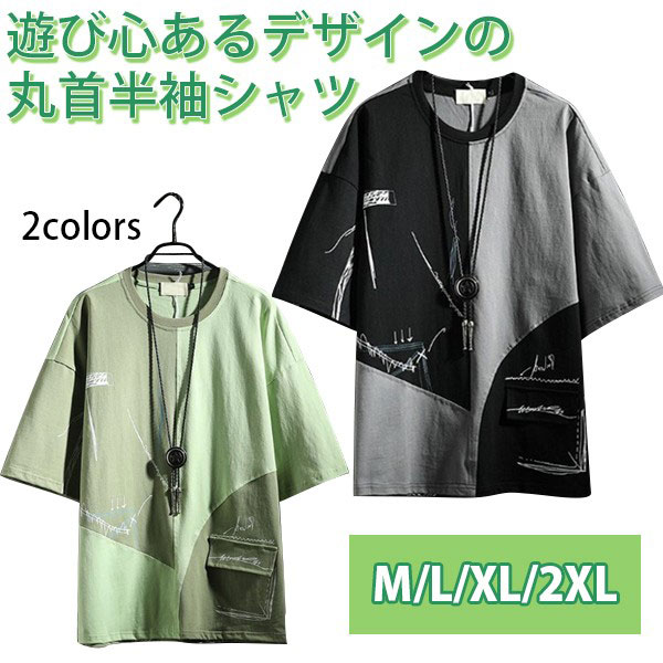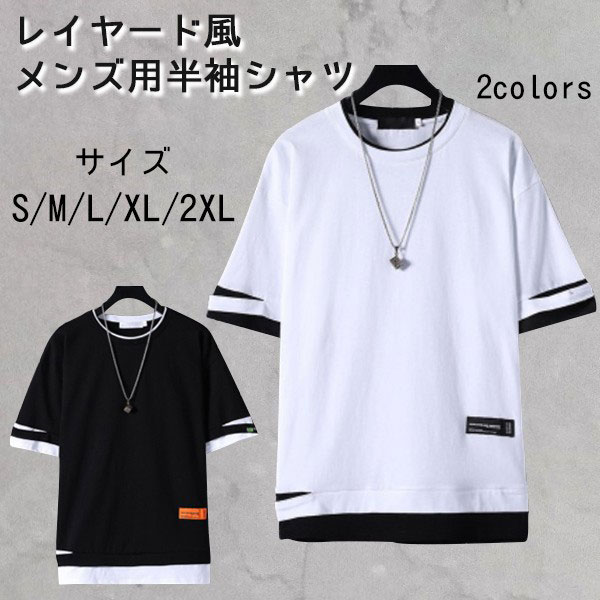 【セール】即納 安い Tシャツ 半袖 メンズ 夏服 レイヤード風 重ね着風 デザイン 配色 カットソー クルーネック ゆったり 夏...