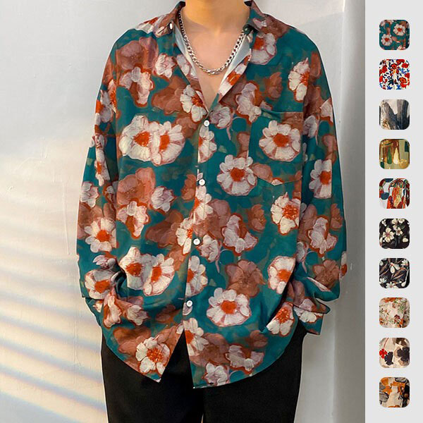【セール】即納 安い メンズ ヴィンテージ柄 総柄 ドレスシャツ 長袖 シャツ オーバーサイズ ゆったり ルーズ ビッグシルエット...