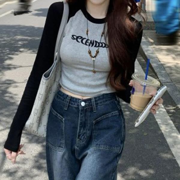 【セール】即納 安い レディース クロップド丈 ラグランスリーブTシャツ 長袖 Tシャツ カットソー ロンT 英字プリント スリム...