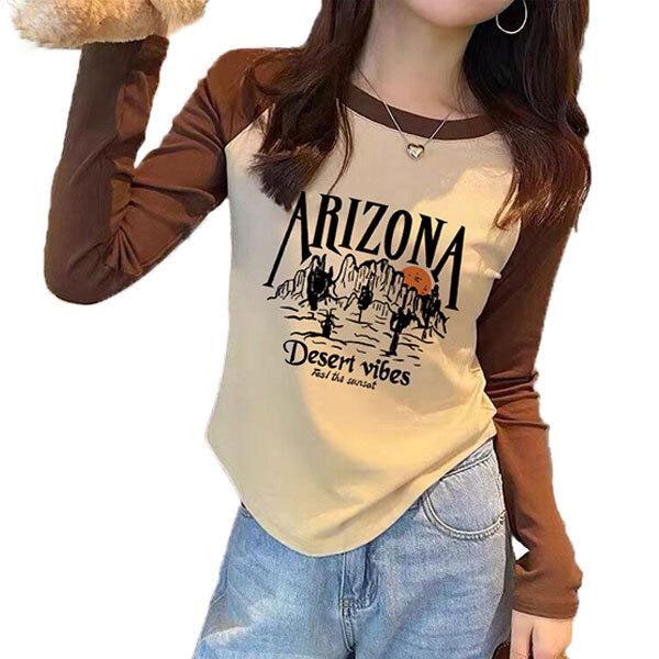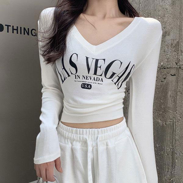 【セール】即納 安い レディース 英字プリント Vネック 長袖 Tシャツ カットソー トップス ショート丈 へそ出し レタープリン...