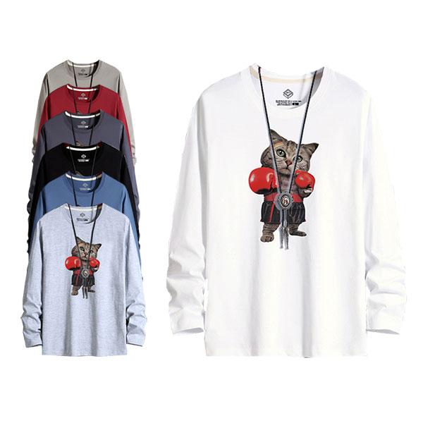 【セール】即納 安い メンズ ロングTシャツ 長袖 カットソー トップス クルーネック プルオーバー プリント 猫柄 原宿系 カジ...